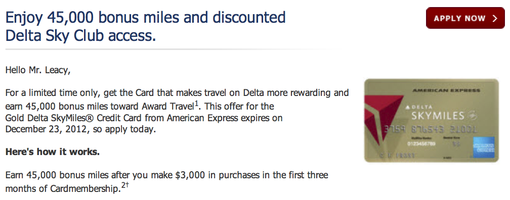 For a limited time only, get the Card that makes travel on Delta more rewarding and earn 45,000 bonus miles toward Award Travel. This offer for the Gold Delta SkyMiles® Credit Card from American Express expires on December 23, 2012, so apply today.