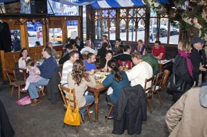 One of my favorite dishes, and a frequent special, is the Schweinshaxe or “pork knuckle.” The outside is crispy, and the meat inside is tender, juicy, and falls apart for your fork. For a lover of pork, the Schweinshaxe is a must. The sausage platter is another excellent choice. Grilled sausages are served over sauerkraut with a side of mashed potatoes garnished with radish slices and grape tomatoes and two kinds of mustard – one is coarse & mild, the other fine & sharp.