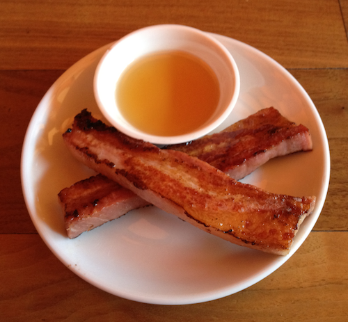 Since I gave up part of my biscuit, I figured that it couldn’t hurt to try the house-cured thick-cut bacon. Two roughly quarter-inch thick strips are served with a side of maple syrup. Those who know me know I love bacon. This was the most bacon-y tasting bacon I have ever had. I cannot recommend it enough. It is smoky, salty, sweet and sinfully fatty.